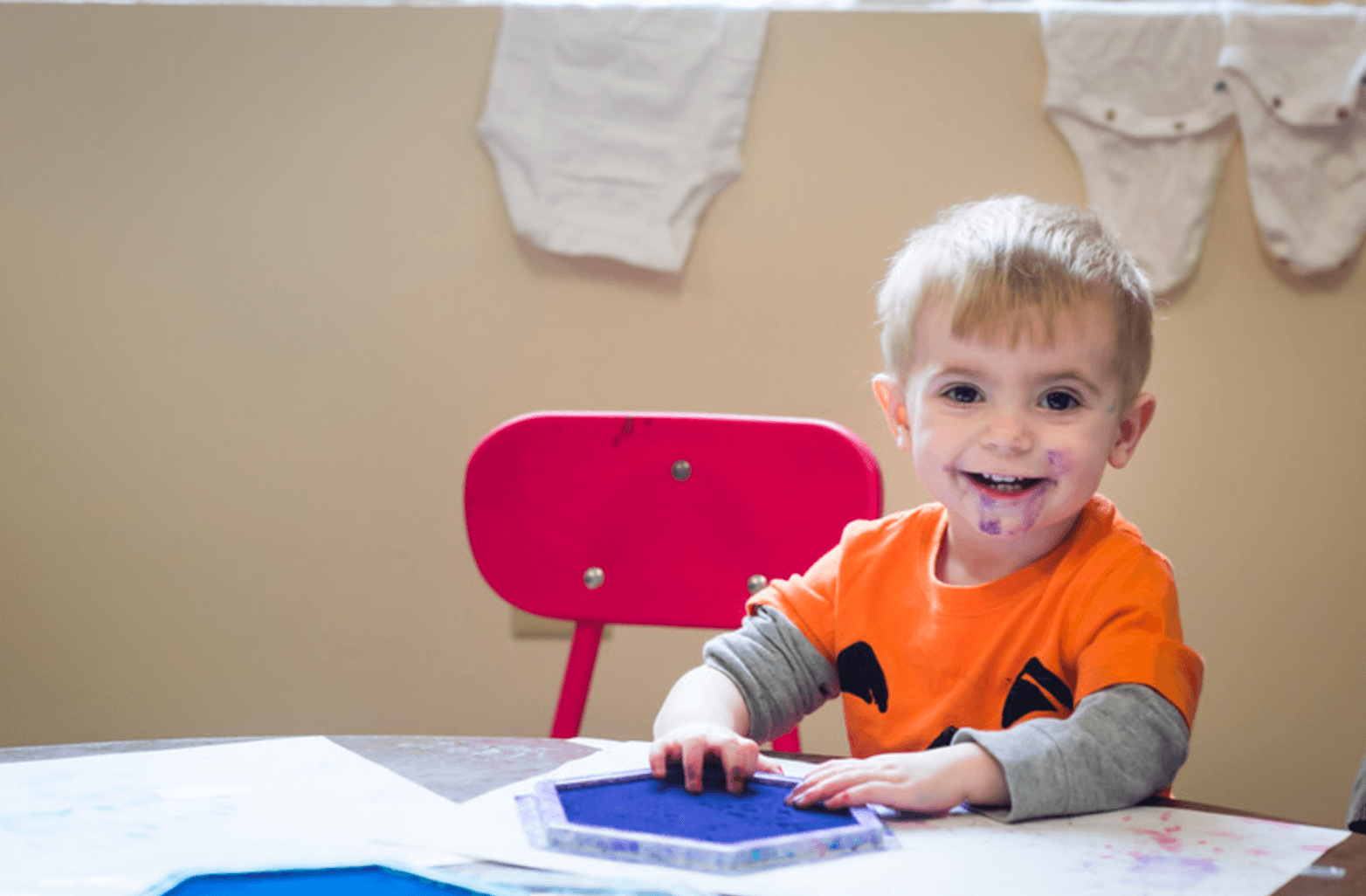 Young child playing with blue ink in the classroom